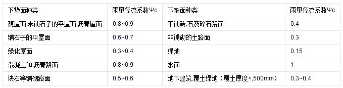 Ψc(雨量径流系数)根据下垫面种类进行取值。可参考下表: